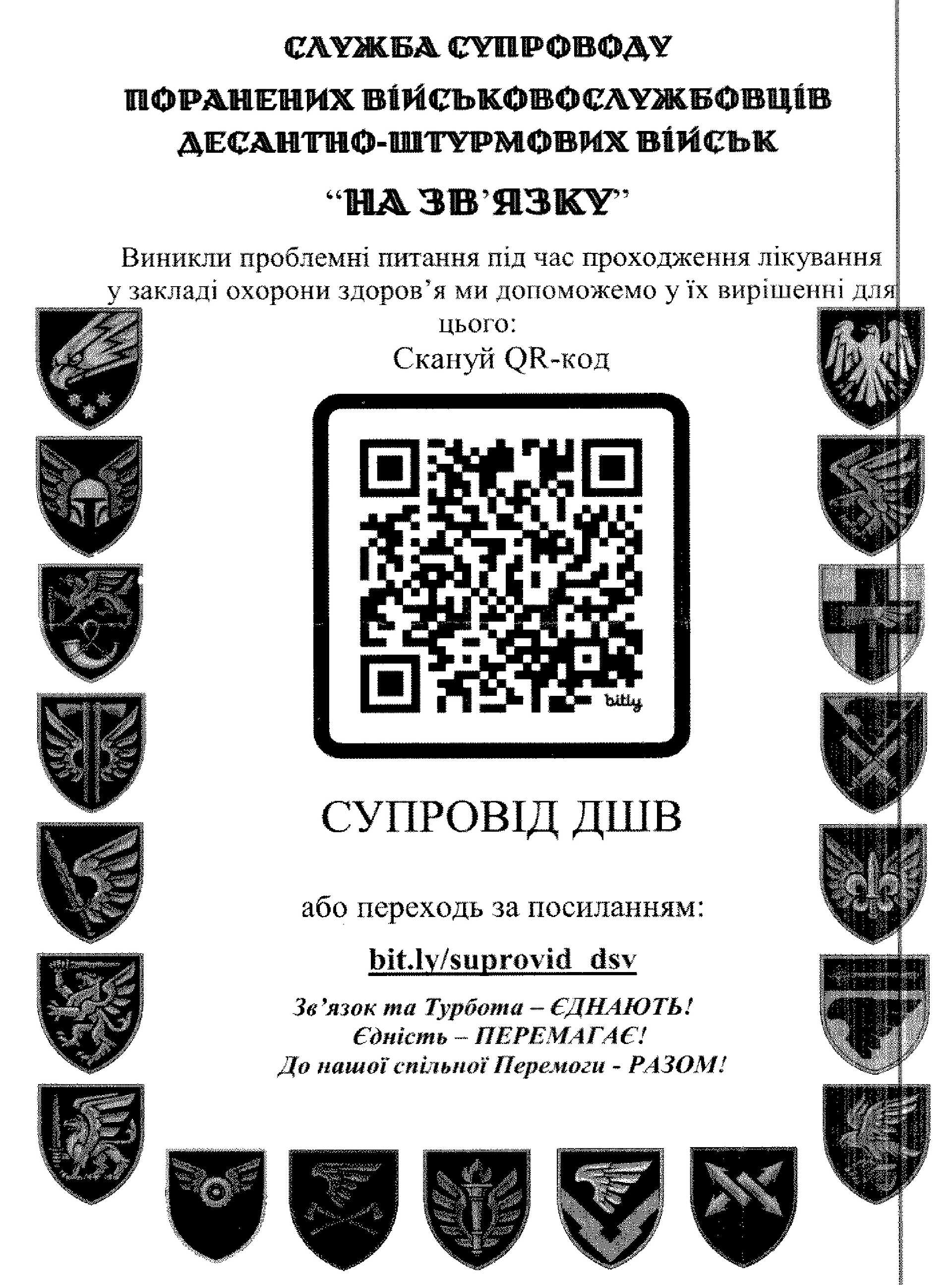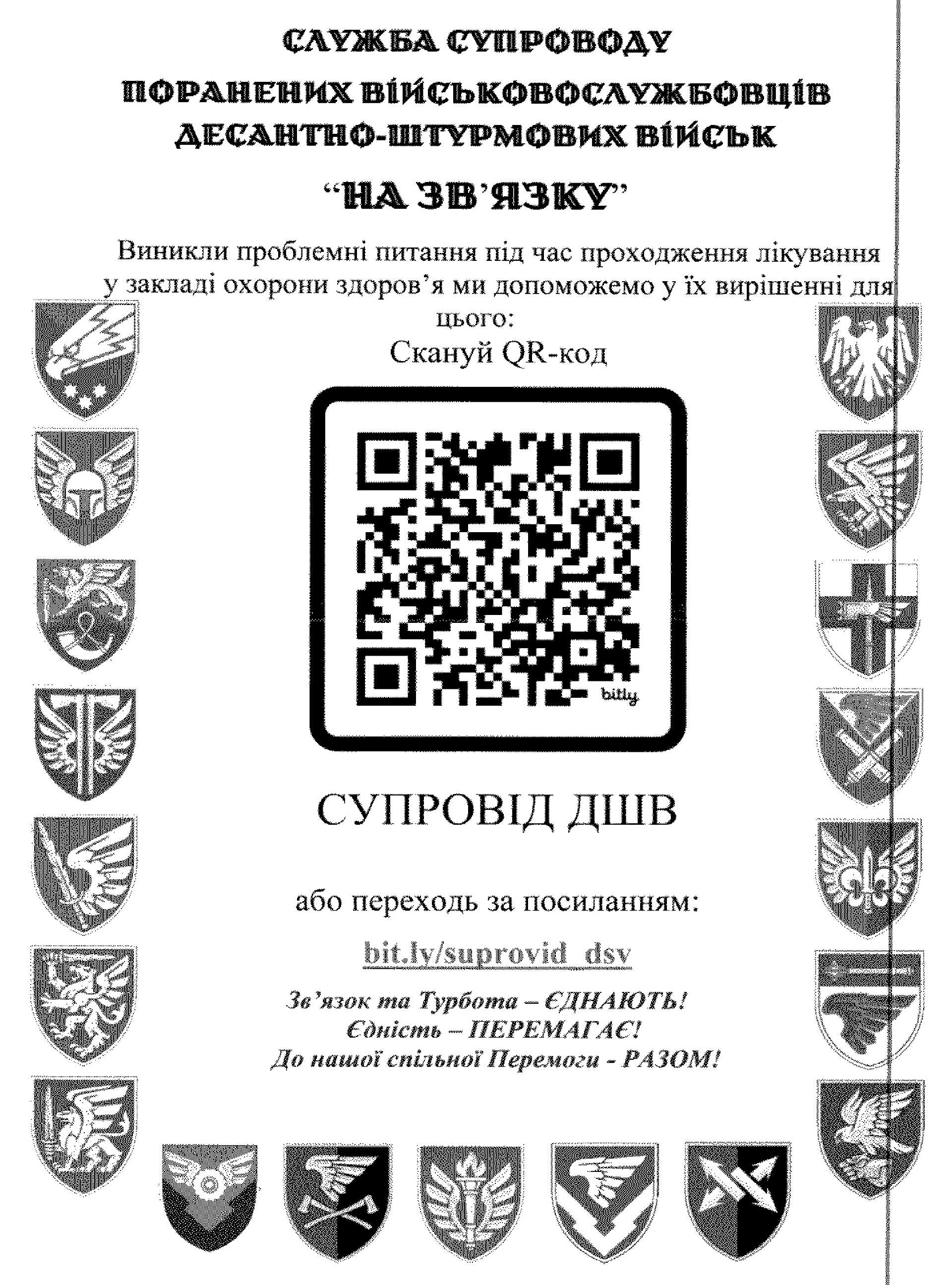 З метою створення та забезпечення ефективного функціонування системи супроводу (патронації) поранених військовослужбовців Десантно-штурмових військ Збройних Сил України, особливо тяжкопоранених (які отримали травму, контузію, каліцтво з наслідками ампутації), що перебувають на лікуванні, реабілітації у закладах охорони здоров’я, членів їх сімей, поширюємо інформацію (з QR-кодом, «Служба супроводу ДШВ ЗСУ») щодо забезпечення вільного доступу до онлайн форми військовослужбовцям з можливістю адресного висвітлення ними проблемних питань стосовно проходження військової служби, в тому числі щодо надання (отримання) належних документів, або їх відновлення в разі знищення (втрати) та встановлення зворотної комунікації зі службами супроводу військових частин Десантно-штурмових військ Збройних Сил України з необхідності забезпечення їх підтримки та патронації.